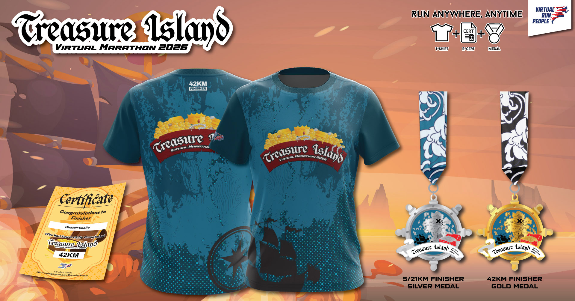 Ahoy, runners! Treasure Island Virtual Marathon 2026 invites you to lace up and set sail on an epic quest where every kilometre brings you closer to hidden treasure and personal victory. Run anywhere, anytime, and conquer your own island adventure as you chase glory, gold, and greatness—because the real treasure is the journey you finish.
